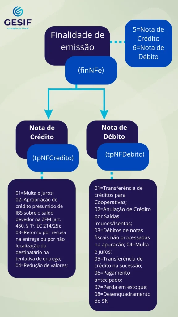 A NT 2025.002-RTC criou na NFe – Mod. 55 as finalidades de emissão Nota de Débito e Nota de Crédito.