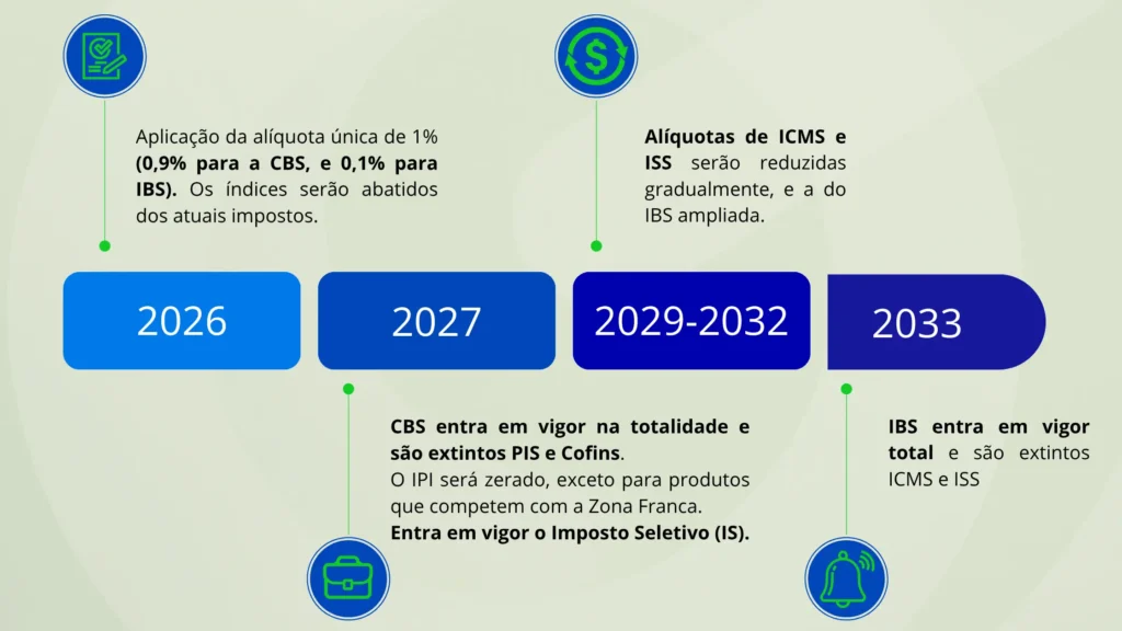 As etapas seguintes, que começam em 2026, iniciam com a introdução da CBS em fase de testes, enquanto o IBS será implantado progressivamente até 2033, quando os tributos atuais — como ICMS, ISS, PIS e COFINS — serão completamente substituídos.